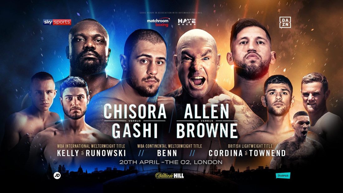 ALLEN-BROWNE/CHISORA-GASHI HEAVYWEIGHT DOUBLE-HEADER LANDS AT THE O2 Rising talents Kelly, Cordina and Benn star on April 20 card Dave Allen faces the biggest night of his career when he takes on former WBA World Champion Lucas Browne on a huge evening of Heavyweight action at The O2 in London on April 20, shown live on … Continue reading HEAVYWEIGHT DOUBLE-HEADER LANDS AT THE O2