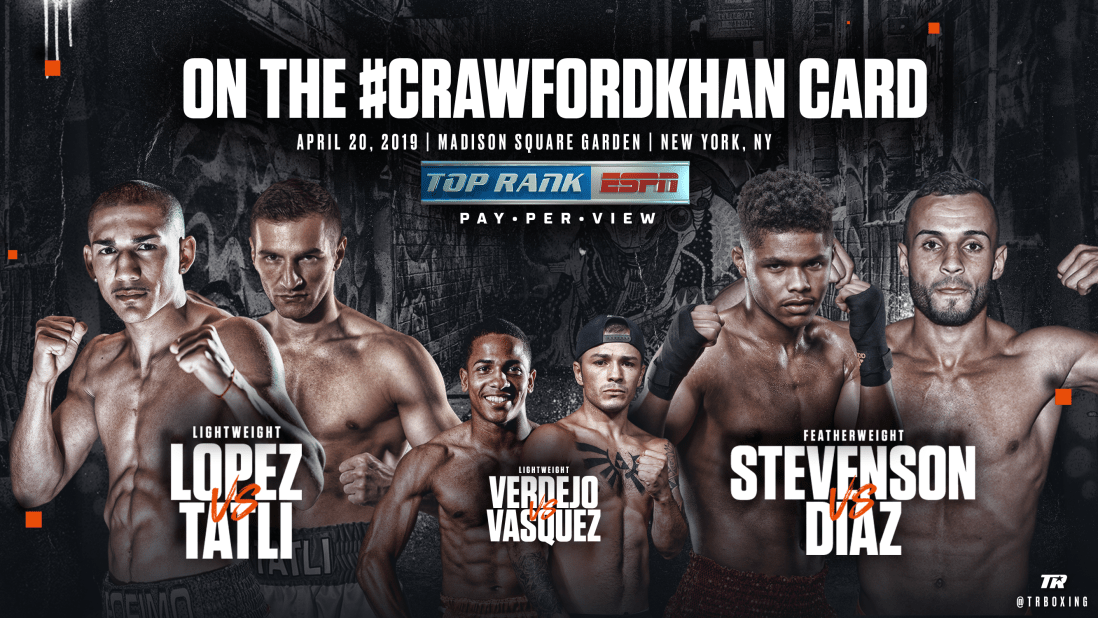 Crawford vs. Khan Undercard: Teofimo Lopez, Shakur Stevenson and Felix Verdejo Ready to Crash Garden Party April 20 on Inaugural PPV under Top Rank on ESPN Banner Before pound-for-pound king Terence “Bud” Crawford enters the ring to defend his WBO welterweight world title against Amir “King” Khan, a pair of 21-year-old wonderkids — Teofimo Lopez … Continue reading Crawford vs. Khan Undercard: Teofimo Lopez, Shakur Stevenson and Felix Verdejo Ready to Crash Garden Party April 20 on Inaugural PPV under Top Rank on ESPN Banner