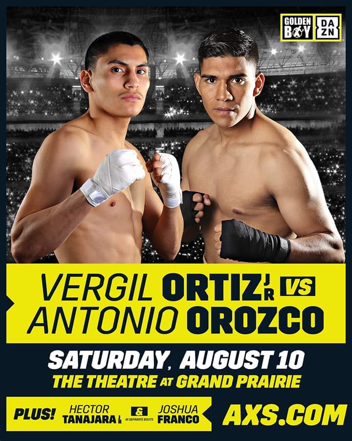VERGIL ORTIZ JR. TO FACE ANTONIO ‘RELENTLESS’ OROZCO IN A HOMETOWN BATTLE IN GRAND PRAIRIE, TEXAS Rising knockout artist Vergil Ortiz Jr. (13-0, 13 KOs) will return to his hometown of Grand Prairie, Texas to face former world title challenger Antonio “Relentless” Orozco (28-1, 17 KOs) in a 10-round main event in the welterweight division. … Continue reading VERGIL ORTIZ JR. TO FACE ANTONIO ‘RELENTLESS’ OROZCO