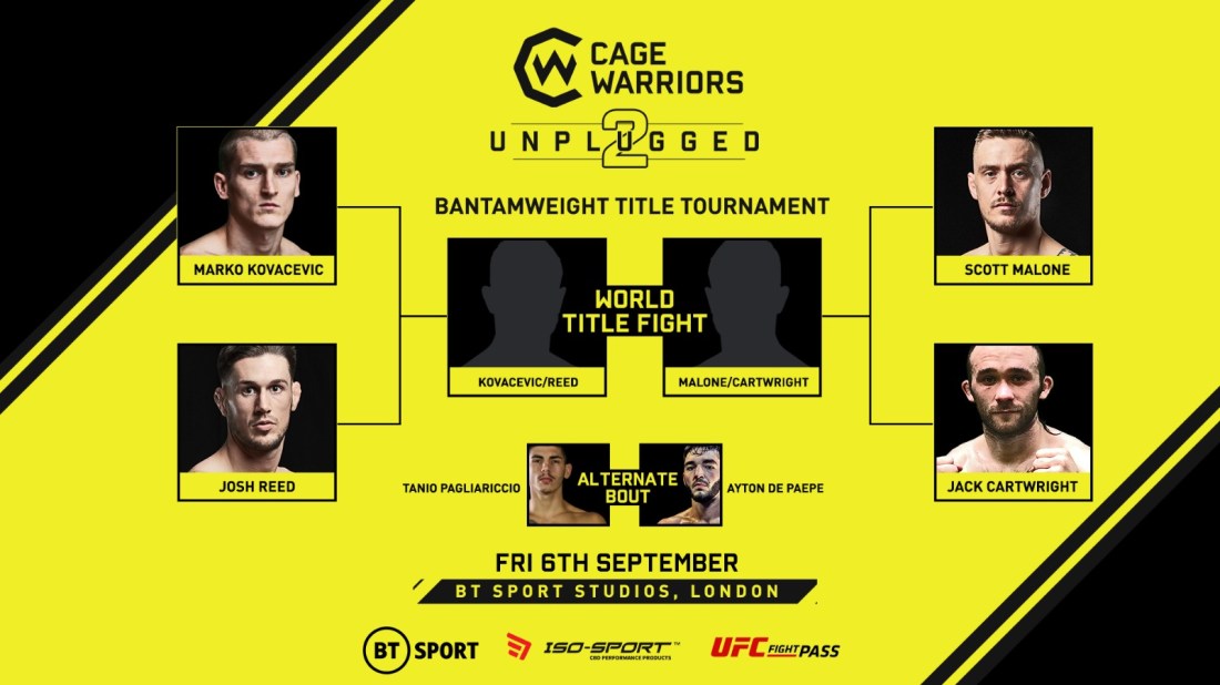 Malone, Reed, Kovacevic and Cartwright Confirmed for CW Unplugged 2 Title Tournament The bantamweight belt is on the line at London’s BT Sport Studios on September 6th, when a one-night tournament will crown a new champion in front of an invite-only crowd. Three former bantamweight title challengers and one of the fastest rising prospects in … Continue reading Malone, Reed, Kovacevic and Cartwright Confirmed for CW Unplugged 2 Title Tournament
