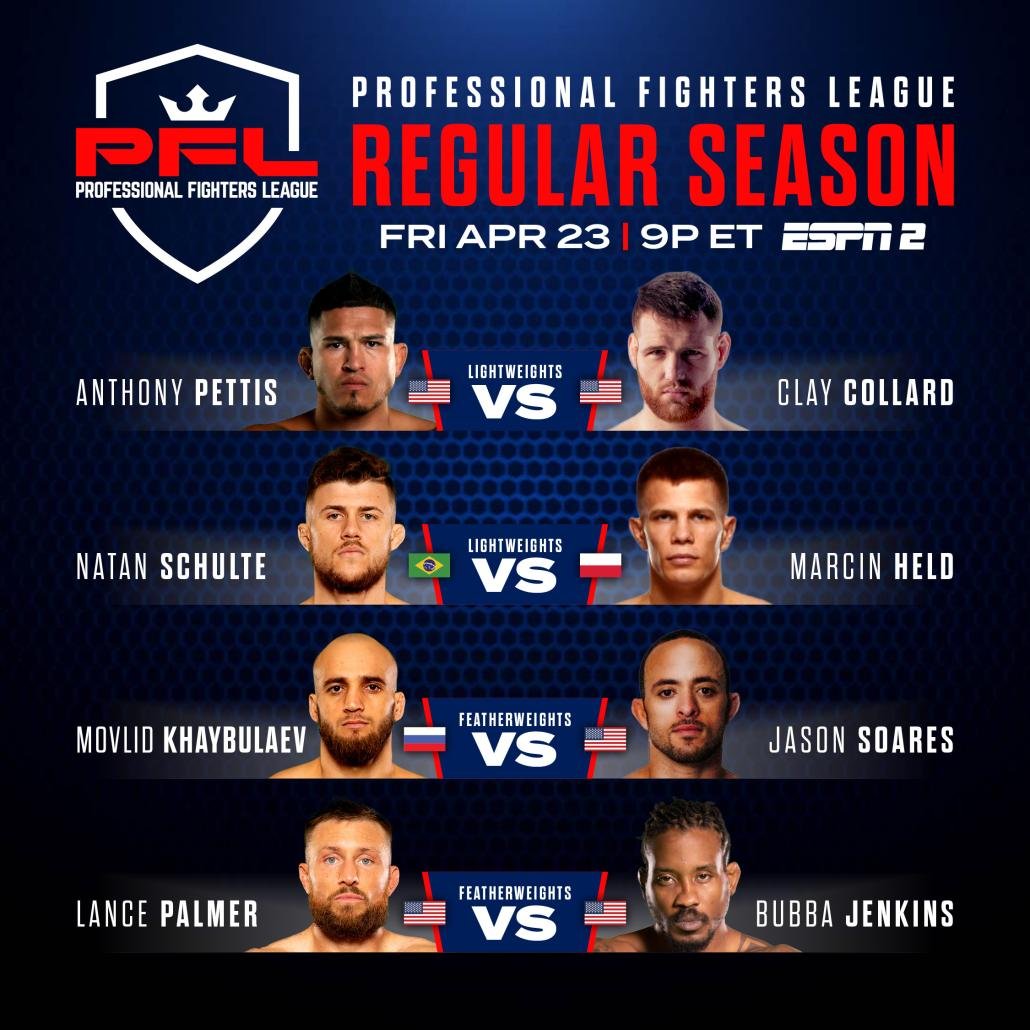 PROFESSIONAL FIGHTERS LEAGUE ANNOUNCES 2021 SEASON KICKOFF MAIN EVENT AND FULL CARD MATCHUPS FOR FEATHERWEIGHTS AND LIGHTWEIGHTS ON APRIL 23 Anthony Pettis and Clay Collard headline PFL 1 in main event; Lance Palmer, Bubba Jenkins, Natan Schulte, Marcin Held, Movlid Khaybulaev and Jason Soares star in PFL 1 main card The Professional Fighters League (PFL), … Continue reading PROFESSIONAL FIGHTERS LEAGUE ANNOUNCES 2021 SEASON KICKOFF MAIN EVENT AND FULL CARD MATCHUPS FOR FEATHERWEIGHTS AND LIGHTWEIGHTS ON APRIL 23