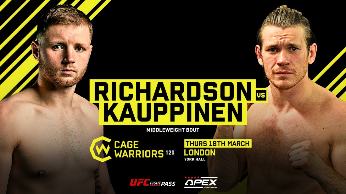 Jamie Richardson Faces Kent Kauppinen In Cage Warriors 120 Main Event The first event of Cage Warriors’ next ‘THE TRILOGY’ series has its headline attraction – a middleweight fight between Jamie Richardson and Kent Kauppinen. The announcement of this all-English clash completes the card, which will take place on Thursday 18th March at London’s York … Continue reading Jamie Richardson Faces Kent Kauppinen In Cage Warriors 120 Main Event