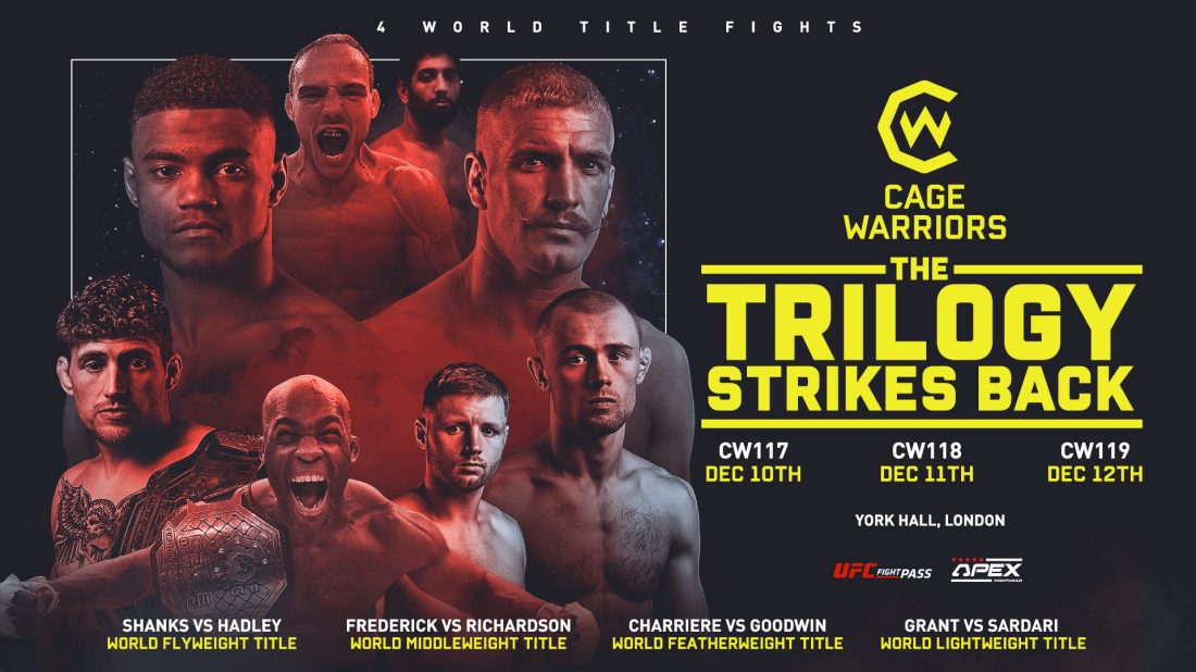 CAGE WARRIORS: THE TRILOGY STRIKES BACK FULL FIGHT CARDS Fight week has arrived! Cage Warriors 117, 118 and 119 will take place this Thursday, Friday and Saturday night. All 3 of the behind-closed-doors events will be broadcast from London’s York Hall, live on UFC FightPass globally and on a host of territorial broadcast partners (see … Continue reading CAGE WARRIORS: THE TRILOGY STRIKES BACK FULL FIGHT CARDS