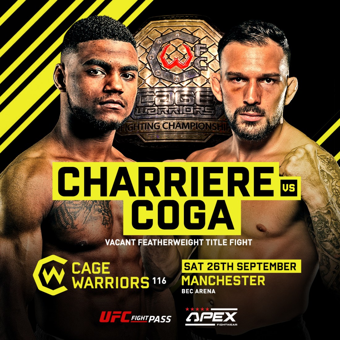 Morgan Charrieré Takes On Max Coga For The Vacant Featherweight Title On September 26th A European superfight has been confirmed for the final night of Cage Warriors’ ‘THE TRILOGY’ series this September. In a clash between two of Europe’s elite at 145lbs, featherweight number one contender Morgan Charrieré (15-7) will clash with “Mad” Max Coga … Continue reading Morgan Charrieré Takes On Max Coga For The Vacant Featherweight Title On September 26th