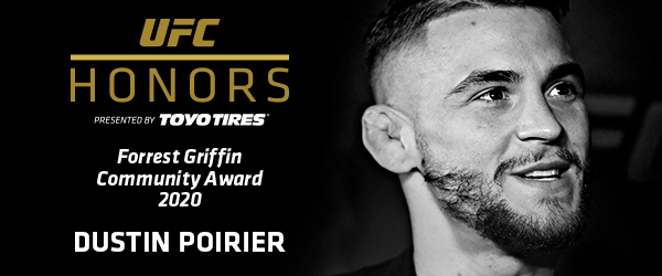 DUSTIN POIRIER NAMED INAUGURAL RECIPIENT OF FORREST GRIFFIN COMMUNITY AWARD PRESENTED BY TOYO TIRES UFC® today announced that former interim UFC lightweight champion Dustin Poirier has been named the inaugural recipient of the Forrest Griffin Community Award, presented by Toyo Tires®. Named in honor of UFC Hall of Famer Forrest Griffin, the award will recognize a UFC athlete … Continue reading DUSTIN POIRIER NAMED INAUGURAL RECIPIENT OF FORREST GRIFFIN COMMUNITY AWARD PRESENTED BY TOYO TIRES