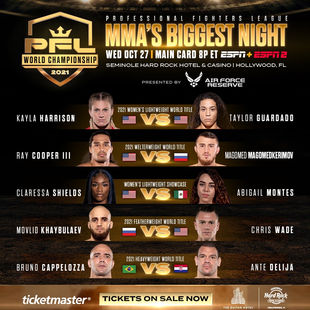 BIGGEST NIGHT IN MMA: PROFESSIONAL FIGHTERS LEAGUE ANNOUNCES FIGHT CARD FOR WORLD CHAMPIONSHIP ON WEDNESDAY, OCTOBER 27 Six World Title Fights with Six Million Dollars on the Line Live on ESPN2 and Simulcast on ESPN+ Kayla Harrison and Taylor Guardado headline PFL World Championship Main Card Two-Time Olympic Gold Medalist Claressa Shields Returns to the … Continue reading BIGGEST NIGHT IN MMA: PROFESSIONAL FIGHTERS LEAGUE ANNOUNCES FIGHT CARD FOR WORLD CHAMPIONSHIP ON WEDNESDAY, OCTOBER 27
