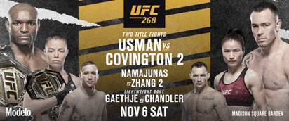 PAIR OF WORLD CHAMPIONSHIP REMATCHESHEADLINE UFC® 268 AT MADISON SQUARE GARDEN UFC® 268: USMAN vs. COVINGTON 2 TICKETS ON SALE FRIDAY, SEPTEMBER 17 FEATURED BOUTS: (C) KAMARU USMAN vs. (#1) COLBY COVINGTON (C) ROSE NAMAJUNAS vs. (#1) ZHANG WEILI JUSTIN GAETHJE vs. MICHAEL CHANDLER UFC® returns to the world famous Madison Square Garden with a … Continue reading PAIR OF WORLD CHAMPIONSHIP REMATCHES HEADLINE UFC® 268 AT MADISON SQUARE GARDEN