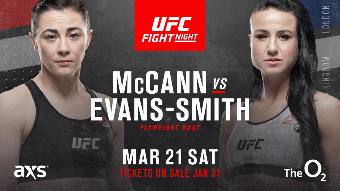 Official: Molly McCann Returns at UFC London The news broke last week but now it has been confirmed. Ashlee Evans-Smith (6-4) will be next in line for Molly McCann (10-2) at UFC London, which takes place at the O2 Arena on March 21st. Liverpool's McCann’s is currently riding an impressive 3 fight win streak after … Continue reading Official: Molly McCann Returns at UFC London