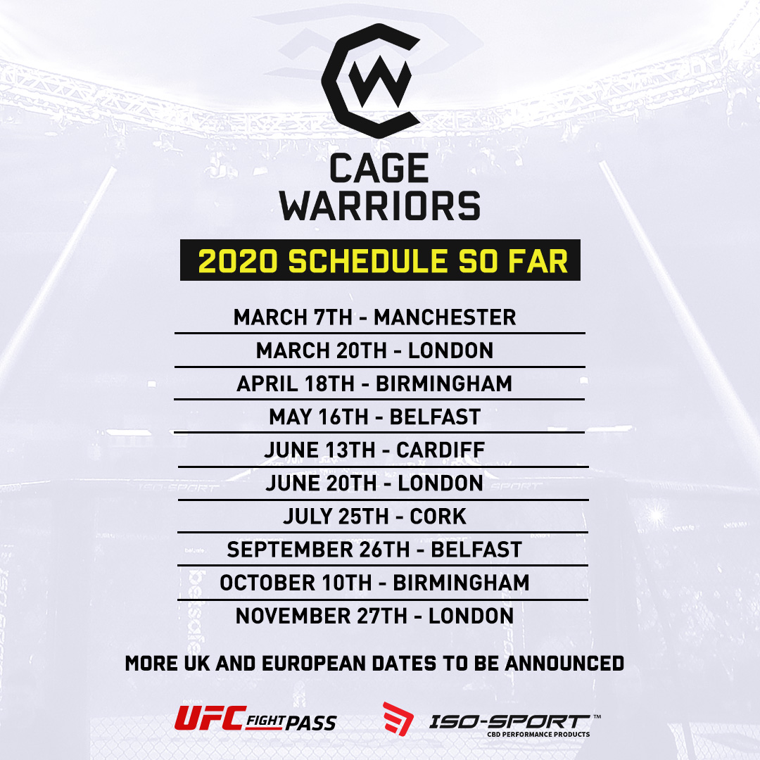 Cage Warriors: Debut Manchester Event Among 7 New UK Dates for 2020 Schedule Cage Warriors confirm 7 new dates for their 15-event 2020 schedule, including their first ever event in Manchester. 2020 will be Cage Warriors’ most ambitious year yet, with a record-breaking 15 events for the promotion. Just added to the schedule are dates … Continue reading Cage Warriors: Debut Manchester Event Among 7 New UK Dates for 2020 Schedule