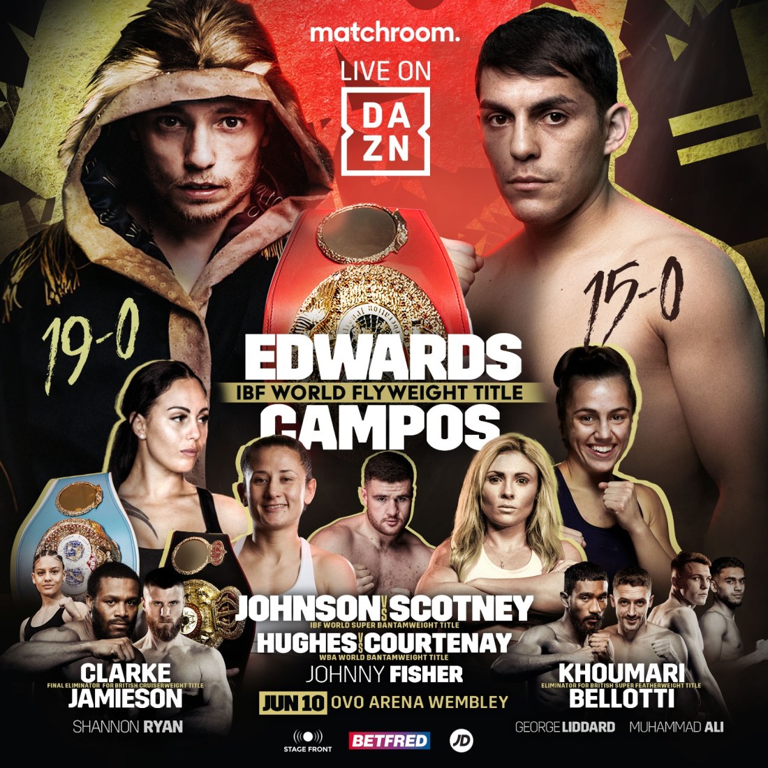 EDWARDS MEETS CAMPOS IN WORLD TITLE TRIPLE-HEADER IN LONDON Sunny Edwards makes fourth defence against Chilean on June 10 as Hughes faces Courtenay and Johnson meets Scotney Sunny Edwards will defend his IBF World Flyweight title against Andres Campos at the OVO Arena Wembley, London on Saturday June 10 live worldwide on DAZN – and topping a blockbuster triple-header … Continue reading EDWARDS MEETS CAMPOS IN WORLD TITLE TRIPLE-HEADER IN LONDON