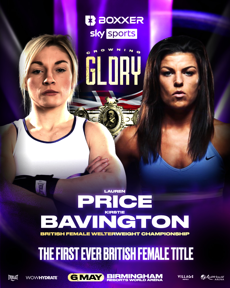 CROWNING GLORY: BOXXER TO STAGE FIRST-EVER BRITISH WOMEN’S CHAMPIONSHIP FIGHT ON MAY 6 AS LAUREN PRICE FACES KIRSTIE BAVINGTON LIVE ON SKY SPORTS First-ever British Women’s Welterweight Champion to be crowned on May 6 Olympic gold medallist Lauren Price MBE faces former European champion Kirstie Bavington at Resorts World Arena, Birmingham BOXXER CEO & Founder … Continue reading CROWNING GLORY: BOXXER TO STAGE FIRST-EVER BRITISH WOMEN’S CHAMPIONSHIP FIGHT ON MAY 6 AS LAUREN PRICE FACES KIRSTIE BAVINGTON LIVE ON SKY SPORTS