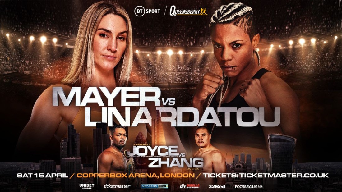 MAYER-LINARDATOU CONFIRMED AS CO-FEATURE TO JOYCE-ZHANG Mikaela Mayer is fighting back in the U.K. for the second time in a row. The former unified super-featherweight belt-holder will make her lightweight debut against former two-time super-lightweight world champion Christina ‘Medusa’ Linardatou on Saturday, 15 April at Copper Box Arena in London, live on BT Sport. Mayer-Linardatou … Continue reading MAYER-LINARDATOU CONFIRMED AS CO-FEATURE TO JOYCE-ZHANG