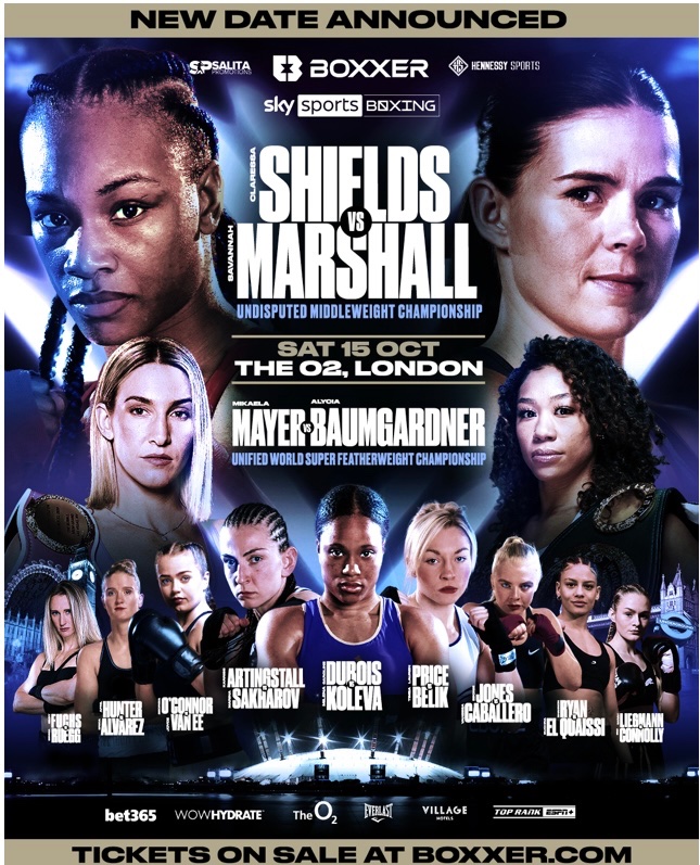 BOXXER: LEGACY - SHIELDS VS MARSHALL AND UNDERCARD CONFIRMED FOR SATURDAY OCTOBER 15th AT THE O2, IN LONDON ● New Date Confirmed For Most Anticipated Fight In The History Of Women’s Boxing ● Original Date Was Postponed By The British Boxing Board Of Control Out Of Respect Following The Passing Of Her Majesty Queen Elizabeth Ii … Continue reading BOXXER: LEGACY – SHIELDS VS MARSHALL AND UNDERCARD CONFIRMED FOR SATURDAY OCTOBER 15th AT THE O2, IN LONDON