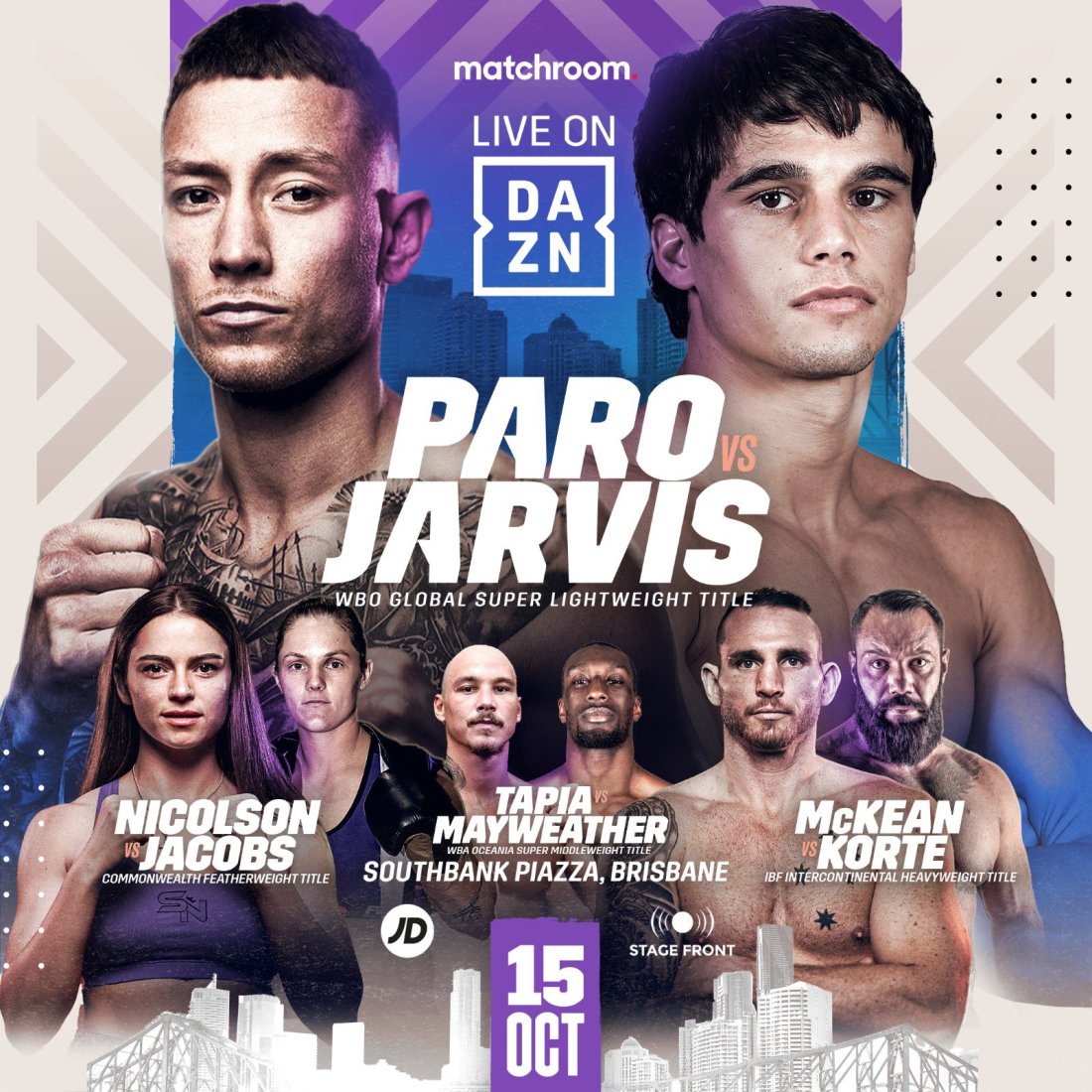 PARO VS. JARVIS LANDS AT THE SOUTH BANK PIAZZA IN BRISBANE AS MATCHROOM KICK OFF NEW ERA IN AUSTRALIA ON OCTOBER 15 Skye Nicolson and Demsey McKean feature on DAZN fight night Down Under Liam Paro and Brock Jarvis will clash for the WBO Global Super-Lightweight Title at the South Bank Piazza in Brisbane on Saturday October 15, live … Continue reading PARO VS. JARVIS LANDS AT THE SOUTH BANK PIAZZA IN BRISBANE AS MATCHROOM KICK OFF NEW ERA IN AUSTRALIA ON OCTOBER 15