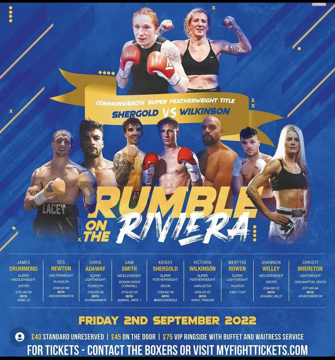 BCB Promotions: Rumble On The Riviera The female Commonwealth super featherweight title will be contested for the first time in Torquay next month. A new champion is to be decided when BCB Promotions stage their first show at the Riviera International Centre, with fight night set for Friday September 2. It’s a golden opportunity for … Continue reading BCB Promotions: Rumble On The Riviera