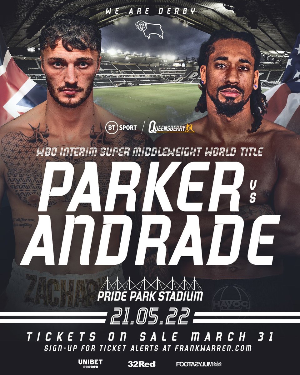 MAY 21: HOME FIXTURE FOR ZACH PARKER Pride Park Stadium, home of Derby County Football Club, will stage the WBO Interim Super Middleweight world title clash between Zach Parker and the unbeaten two-weight world champion Demetrius Andrade on Saturday, 21st May 2022, live on BT Sport. In what will be a huge occasion for knockout … Continue reading MAY 21: HOME FIXTURE FOR ZACH PARKER