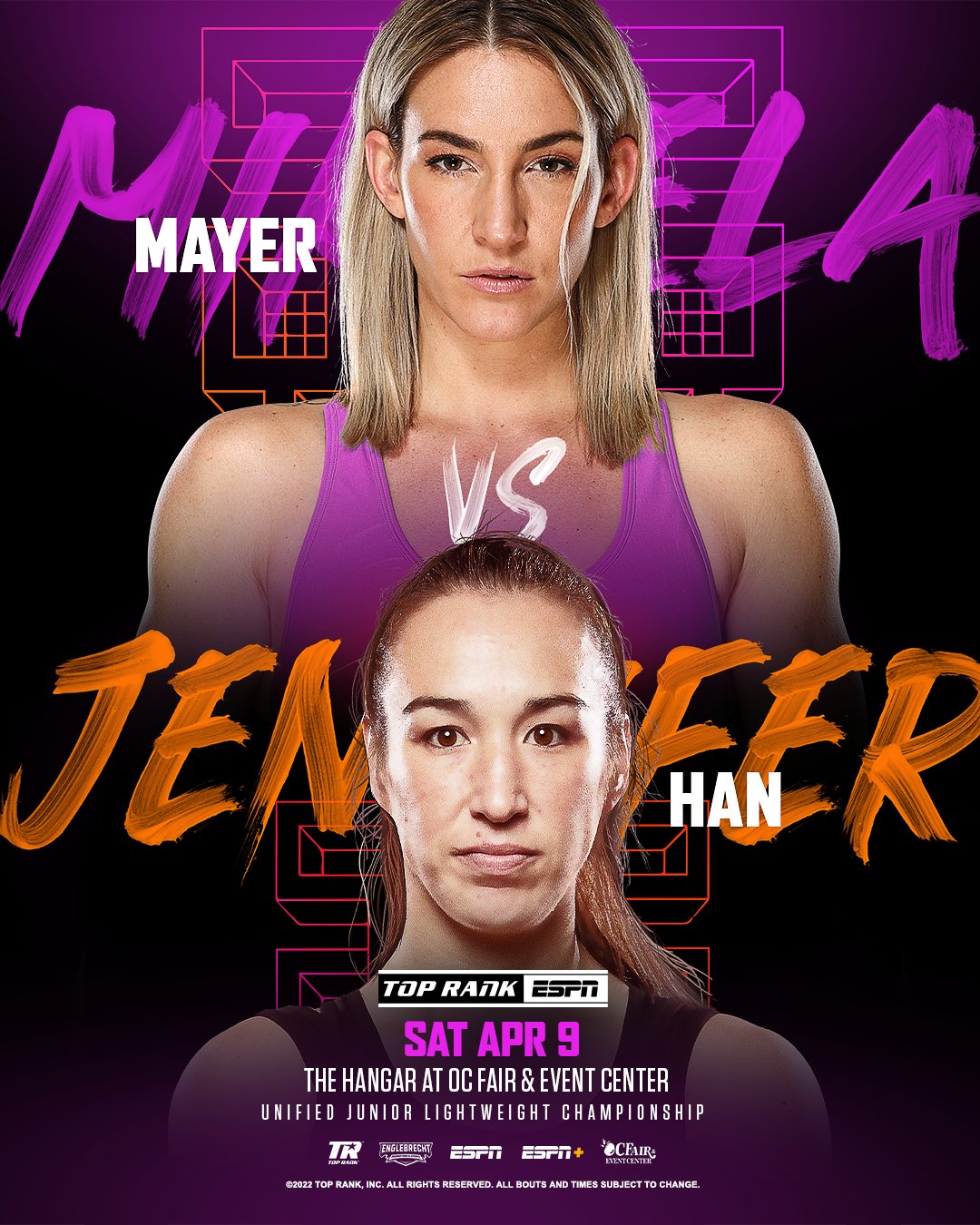 April 9: Mikaela Mayer Returns to SoCal in Homecoming Defense of Unified Championship against Jennifer Han at The Hangar in Costa Mesa and LIVE on ESPN WBO/IBF unified junior lightweight world champion Mikaela Mayer hasn’t fought in front of a hometown crowd in four years, but that all changes Saturday, April 9, as SoCal’s Olympic … Continue reading Mikaela Mayer Returns to SoCal in Homecoming Defense of Unified Championship against Jennifer Han