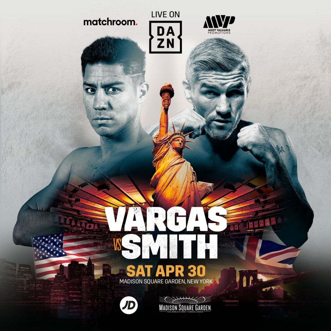 VARGAS AND SMITH CLASH ON TAYLOR-SERRANO UNDERCARD Super-Welterweight crossroads battle leads New York undercard on April 30Jessie Vargas and Liam Smith collide in a must-win Super-Welterweight clash at Madison Square Garden in New York on Saturday April 30, live worldwide on DAZN, leading the undercard for the historic clash between Katie Taylor and Amanda Serrano, brought to you by … Continue reading VARGAS AND SMITH CLASH ON TAYLOR-SERRANO UNDERCARD