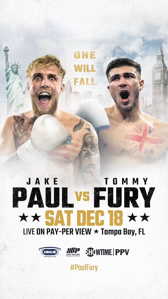 GLOBAL STAR JAKE PAUL TO FACE UNDEFEATED PROFESSIONAL BOXER TOMMY FURY ON SATURDAY, DECEMBER 18 ON SHOWTIME PPV® Paul And Fury Put Their Undefeated Pro Boxing Records on the Line Live at Amalie Arena in Tampa, Fla.Tickets Go On Sale Wednesday, November 10International superstar Jake “The Problem Child” Paul will face undefeated professional boxer and U.K. reality … Continue reading GLOBAL STAR JAKE PAUL TO FACE UNDEFEATED PROFESSIONAL BOXER TOMMY FURY ON SATURDAY, DECEMBER 18 ON SHOWTIME PPV®