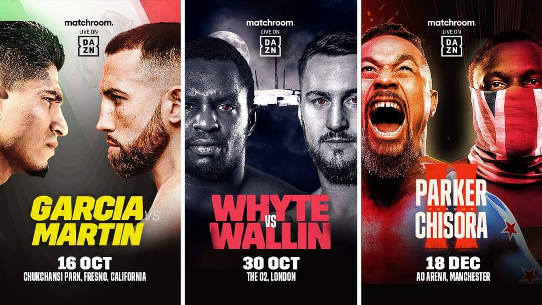 DAZN and Matchroom announce more global additions to growing fall fight schedule Mikey Garcia vs. Sandor Martin on Saturday, October 16 Dillian Whyte vs. Otto Wallin on Saturday, October 30 Joseph Parker vs. Derek Chisora II on Saturday, December 18 DAZN and Matchroom have announced three premium fights nights to add to an ever-increasing fall … Continue reading DAZN and Matchroom announce more global additions to growing fall fight schedule