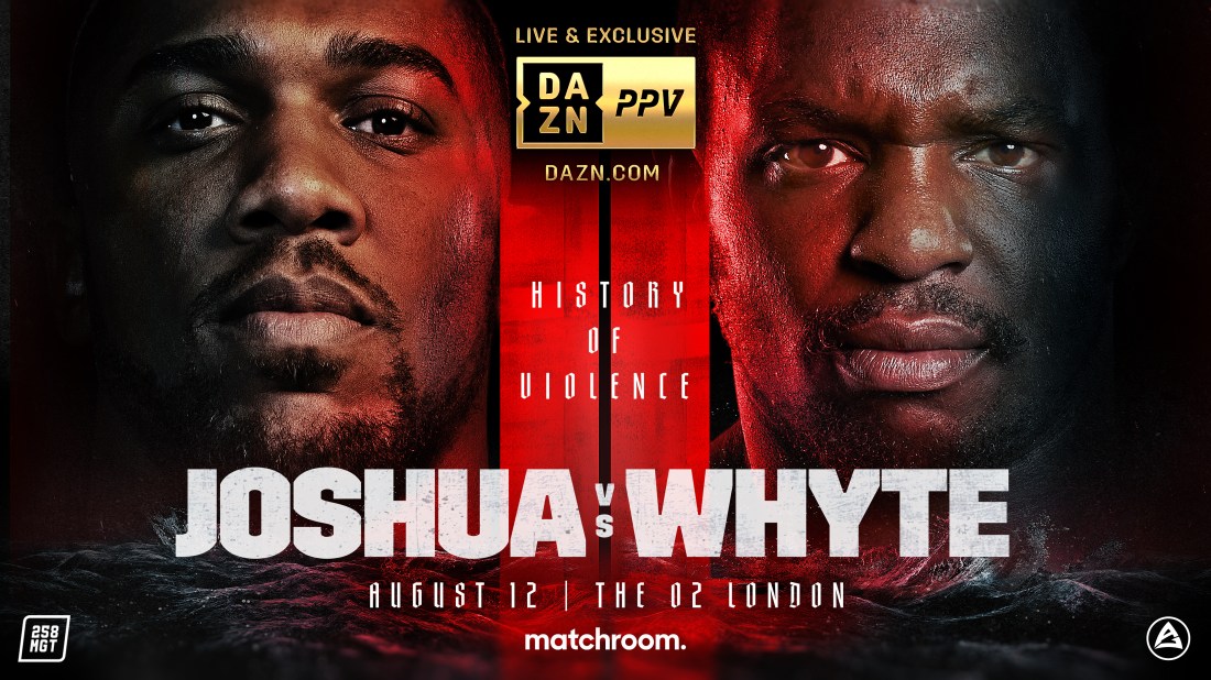 BITTER RIVALS ANTHONY JOSHUA AND DILLIAN WHYTE REMATCH AT THE O2 ON AUGUST 12 LIVE ON DAZN PPV ‘AJ’ and ‘The Body Snatcher’ reignite explosive feud British Heavyweight rivals Anthony Joshua and Dillian Whyte will meet in an explosive rematch at The O2 in London on Saturday August 12, shown exclusively live on DAZN around the world and on DAZN PPV in the UK and … Continue reading BITTER RIVALS ANTHONY JOSHUA AND DILLIAN WHYTE REMATCH AT THE O2 ON AUGUST 12 LIVE ON DAZN PPV