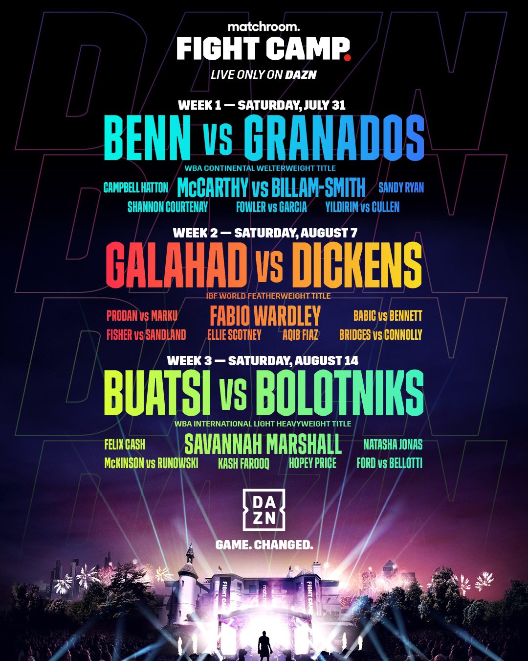MATCHROOM FIGHT CAMP RETURNS WITH THREE BACK-TO-BACK WEEKENDS AS GAME-CHANGING GLOBAL FIVE-YEAR DEAL WITH DAZN BEGINS IN THE UK Matchroom Fight Camp returns with three back-to-back weekends as game-changing global five-year deal with DAZN begins in the UK Ground-breaking series returns across July 31, August 7 and August 14 as Matchroom welcome fans to their … Continue reading MATCHROOM FIGHT CAMP RETURNS WITH THREE BACK-TO-BACK WEEKENDS AS GAME-CHANGING GLOBAL FIVE-YEAR DEAL WITH DAZN BEGINS IN THE UK