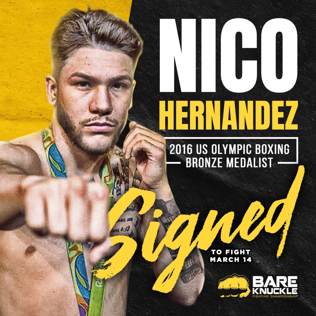 BARE KNUCKLE FIGHTING CHAMPIONSHIP ANNOUNCES SIGNING OF 2016 U.S. OLYMPIAN & BRONZE MEDALIST NICO HERNANDEZ